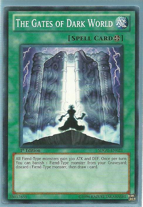Como o deck trabalha no descartar da mão, essas duas cartas podem ser ótimos suportes. Como já havia dito cartas do Dark World são bem vindas neste deck dando atenção maior para The Gates of Dark World, pois já que é um campo mágico tem efeitos contínuos podendo ser usados em todos os turnos, já a Card Destruction descarta sua mão inteira tornando possível usar vários efeitos ao mesmo tempo.